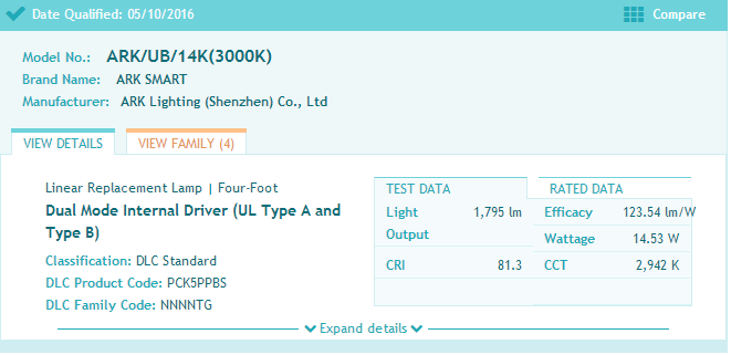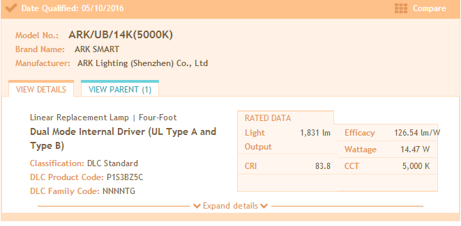Certifications of ARK lighting 130lm/w 14w glass led tube UL DLC listed led tube